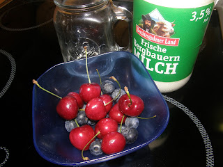 You start with taking out the cherry seed. And of course you can use some other fruits too, but be careful, not all fruits are good with milk or in combination with another fruit. So, after you have done this, measure how much milk you will need, but be careful don't fill up the jar/cup to the top let out at least one fouth out. Now add the blueberries and cherries and mix them together with the milk. Now you have to only fill up the jap/cup and you are done. Enjoy it!